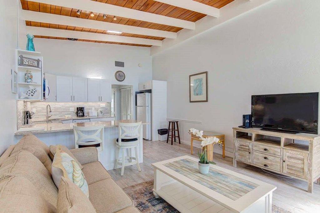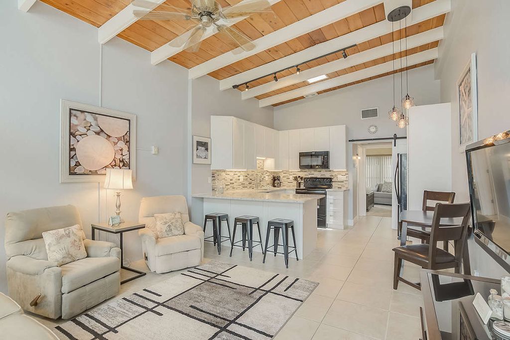 Our fully equipped kitchens allow for easy entertaining while making delicious home-cooked meals. The units have either a king- or a queen-bed and some also offer a twin-size bed in the bedroom. All units are furnished with a sofa bed in the living room. Some amenities include hair dryers, Keurig coffee makers, towels and linens, access to a shared coin operated laundry room, and on-site management. The units along Seaside Drive boast separate patio areas along Seaside Drive and in 2024, we expanded the patio area near the beach – a perfect spot to watch the spectacular sunsets of Siesta Key. There are gas grills behind the units on Seaside Drive as well as two gas grills and tables by the beach. We have a large, heated swimming pool with a new extension added on this past fall a shuffleboard court and cornhole set on turf.